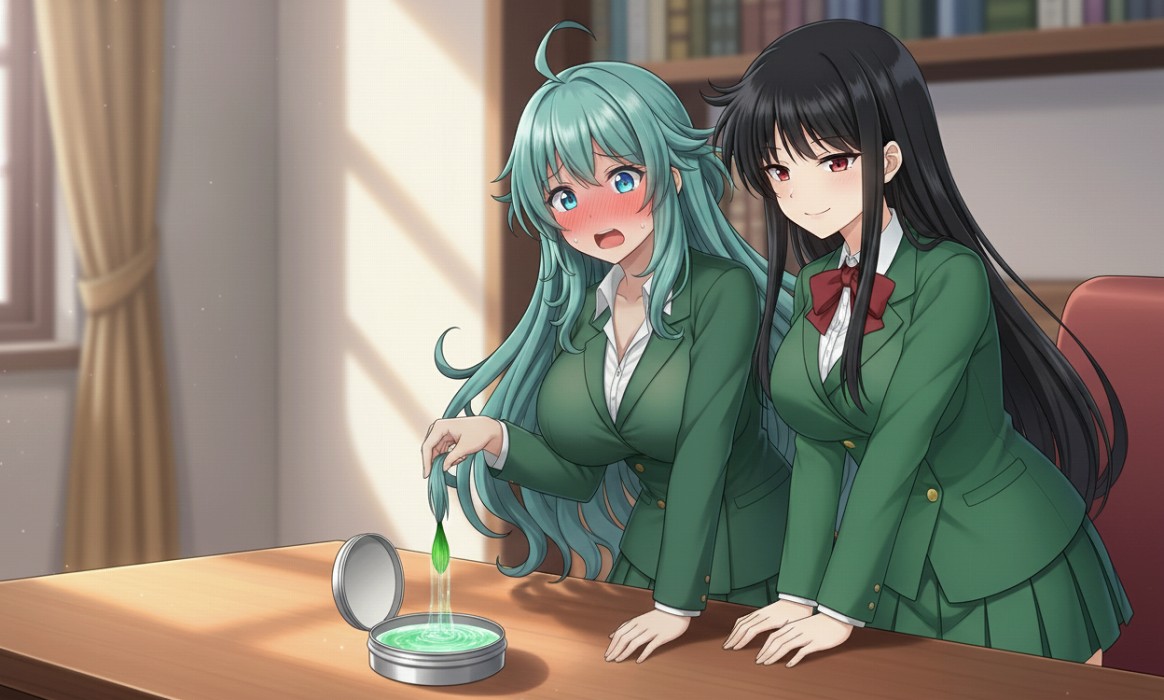 ソニアはそう言い放つと、自分の前髪をつまんで液体に浸した。液体は緑っぽい色に染まり、ソニアの顔はみるみる赤くなっていく。