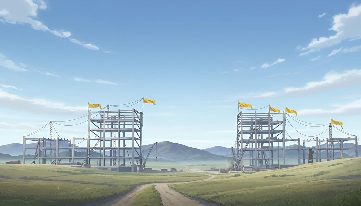 仮設ホームに降りると、砕石が靴底でざりっと鳴る。風に乗って油と木材の甘い匂い。遠くで転圧機の低い鼓動が続き、仮設事務所の黄色い旗がぱたぱた揺れた。