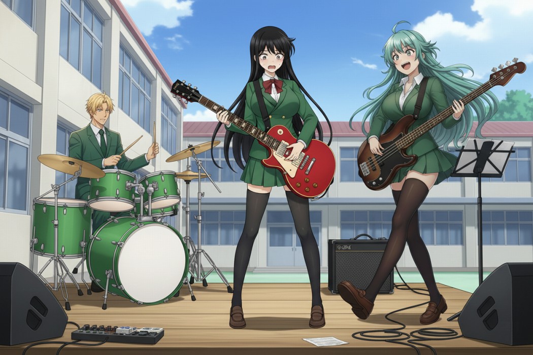 部活の時間になり、今日は早速校内ライブをやることにしたので、みんな楽器を部室の外に運び出していた。部室は第二予備棟の一階にあり、裏口を出てすぐのところにそれぞれセットしていった。