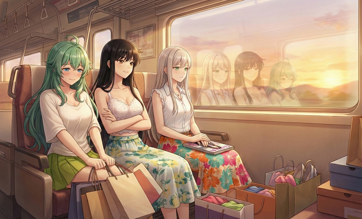結局、帰りの汽車に乗る頃には、足元はソニアの新しい靴や服の入った袋でいっぱいになっていた。列車の窓に映る三人の横顔は、誰も化粧なんてしていないのに、やけに華やかに見えた。素材がいい、というユコの言葉は、あながち大げさでもないのだろう。