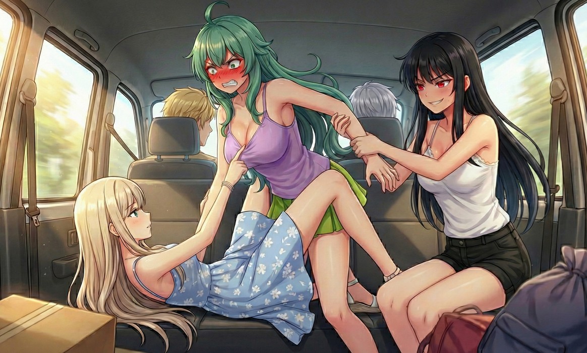 ソニアはいつものキャミとミニスカで、前かがみになって前部座席に乗り出しているのだ。そのため、際どい丈のミニスカートは持ち上がり、後ろから見ると危うい状態なのである。