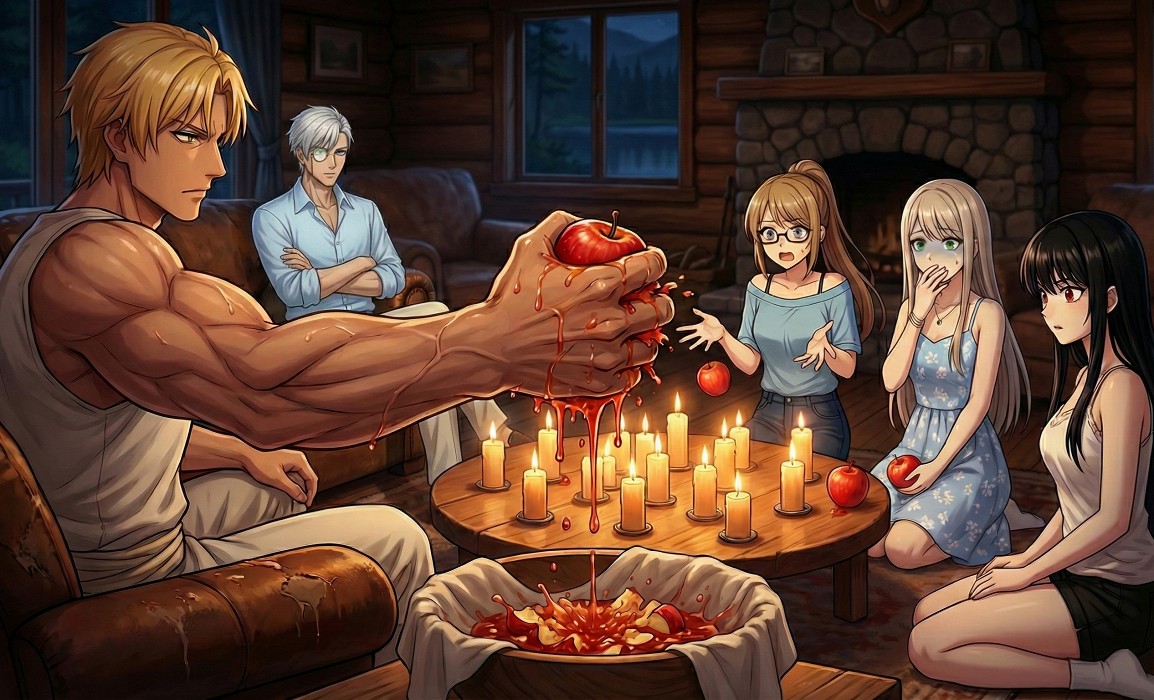 ラムリーザたちはリビングに集まり、輪になって怪談を語っている。ラムリーザとリゲルはソファーに並んで座り、その前の床に、左からロザリーン、ユコ、リリス、ソニアの順で座っている。