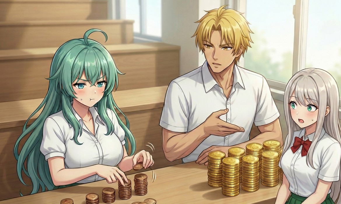 休み時間、ソニアは机に硬貨を並べて数えていた。