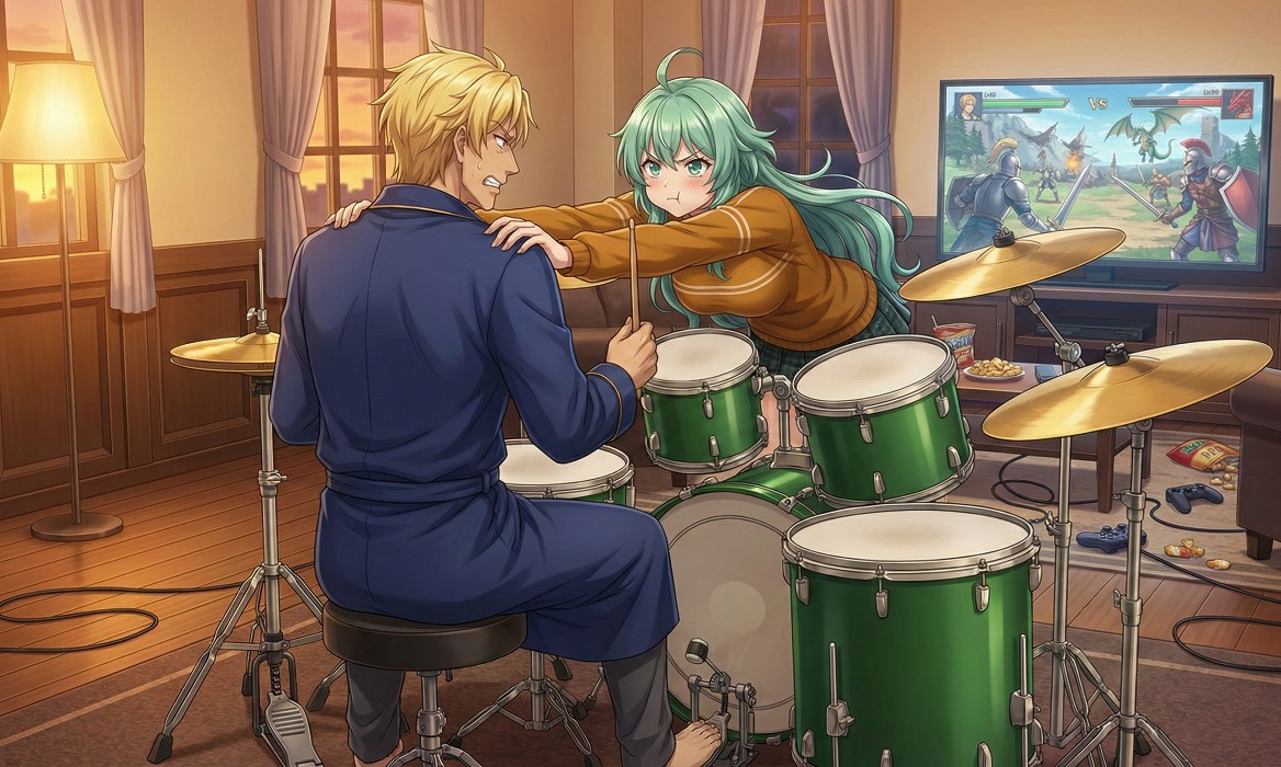 日も暮れかけた頃、ラムリーザはドラムを叩いて過ごしていた。メトロノームの音に合わせて、チェンジアップとチェンジダウンを繰り返しながら、横目でソニアのゲーム画面を眺めていた。