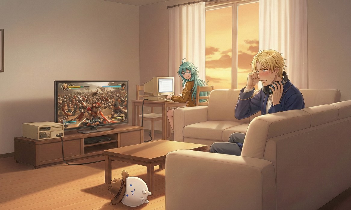 ゲーム機をテレビとマイコンに繋ぎ、両方に表示ができるようにした。テレビを見ながらプレイして、マイコンに表示したものを録画する手はずになっていた。録画ソフトと録音ソフトは、マイコンにインストールしている。